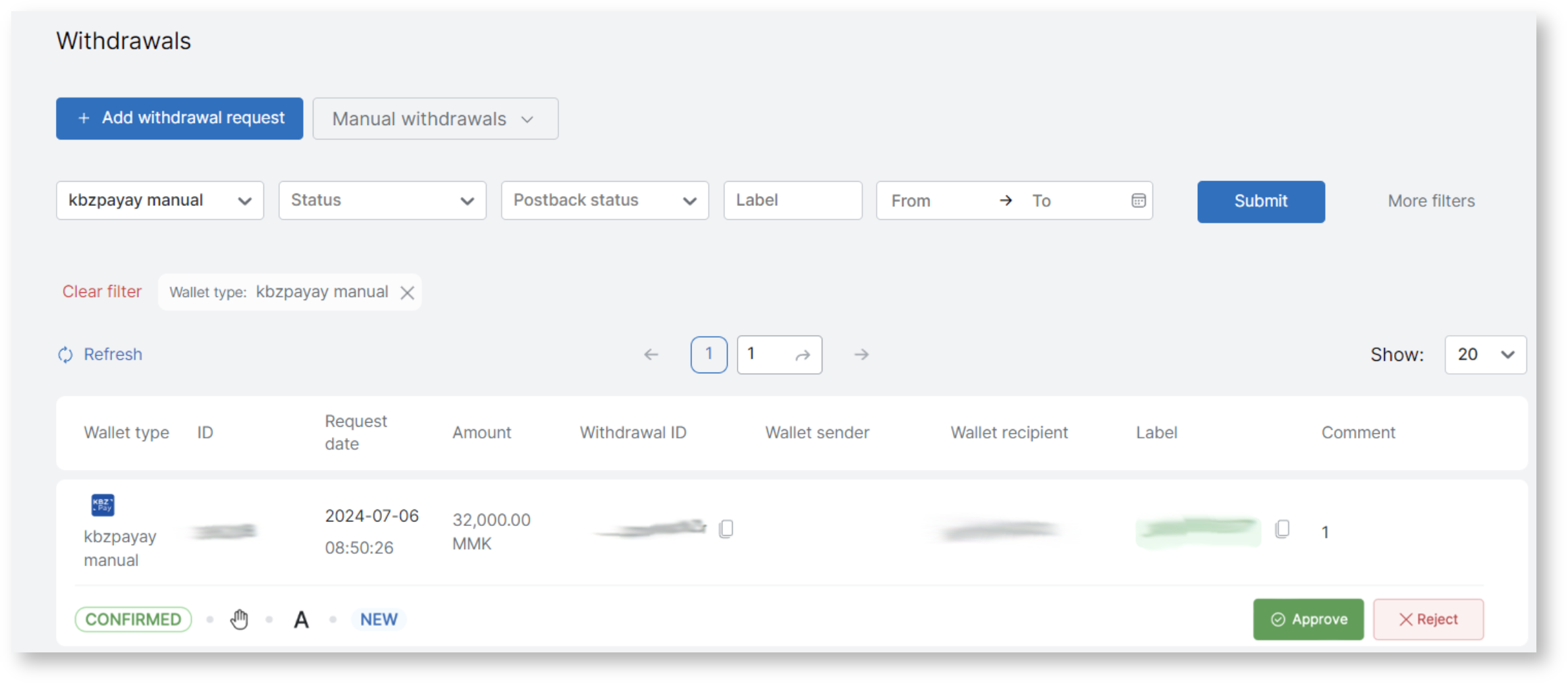 To create a withdrawal request, you need to go to the Withdrawals page Payments → Withdrawals and perform the following steps