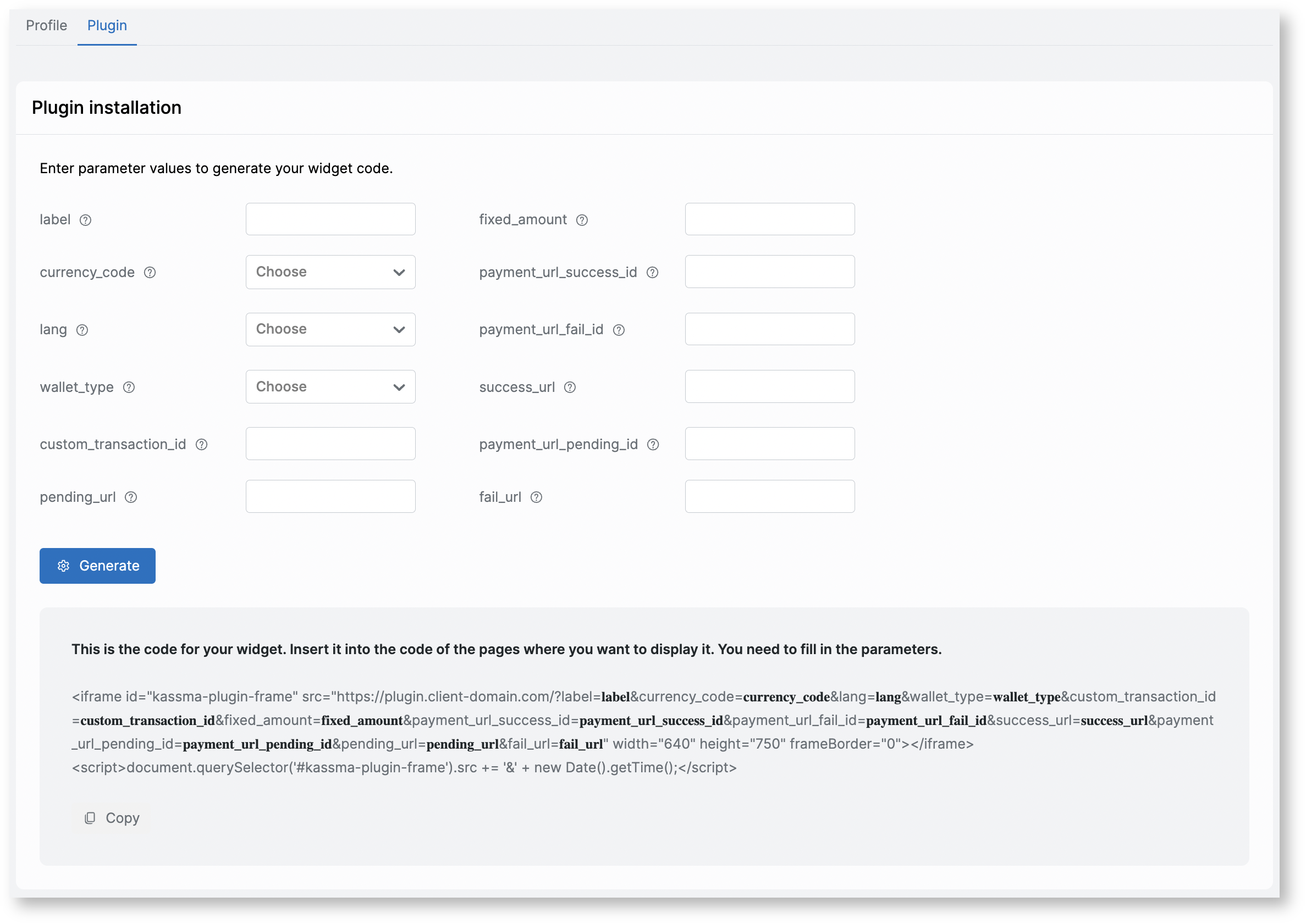 This section contains the body of the plugin that is integrated into the Client’s site and a description of parameters that are entered.