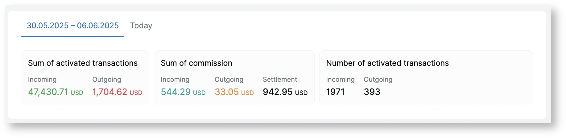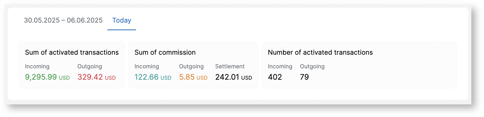 Statistical information on the amount of activated transactions, the number of activated transactions for the above period and similar information for the current day.