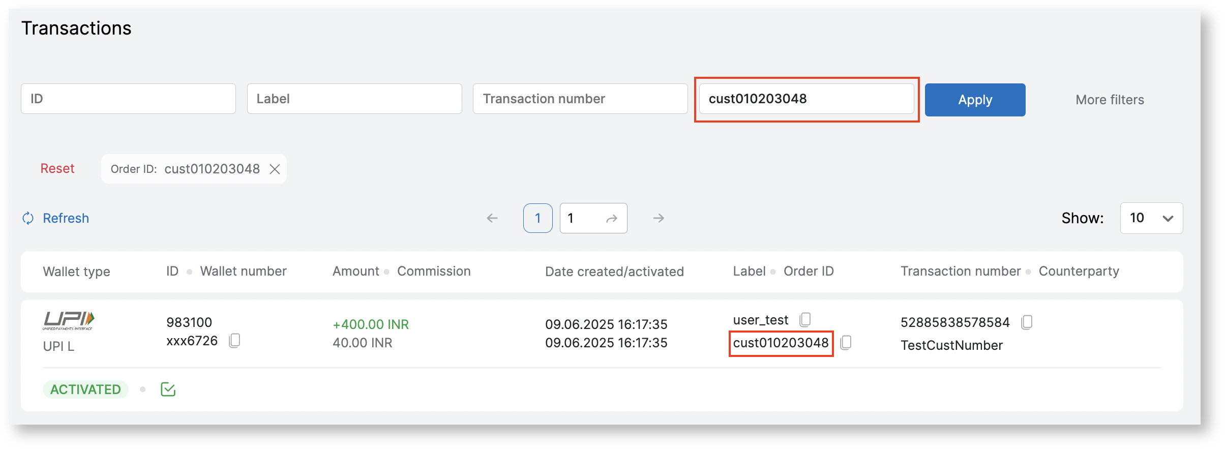 Then all user transactions will be displayed on the page, you need to find the user’s transaction by “Transaction number” or “Order ID” and pay attention to “Status” and “Postback status”