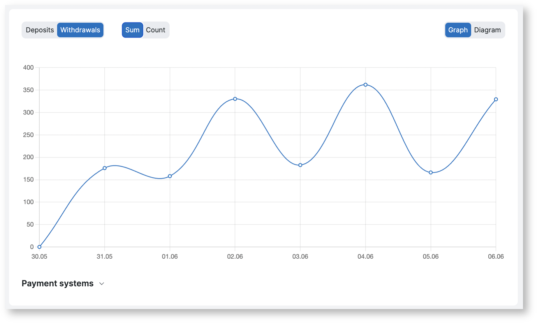 The “Dashboard” page contains basic summary statistical information on payment systems. You can create a graph of transactions/withdrawals for a certain period, for a certain country, display data on the graph in a certain currency.