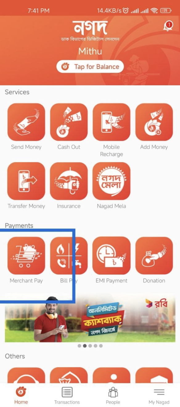The user goes to the Nagad service and makes payments there depending on the account type of the provided wallet.