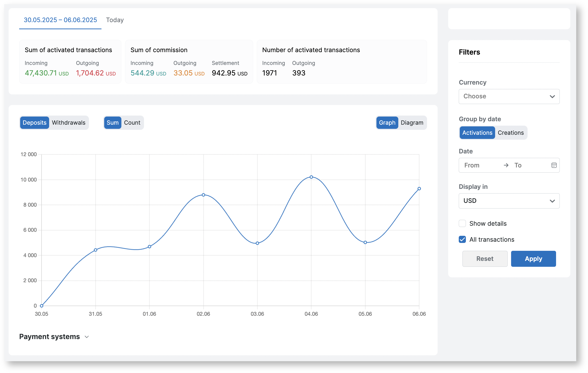 - включает/ выключает отображение данных по выбранным платежным системам.