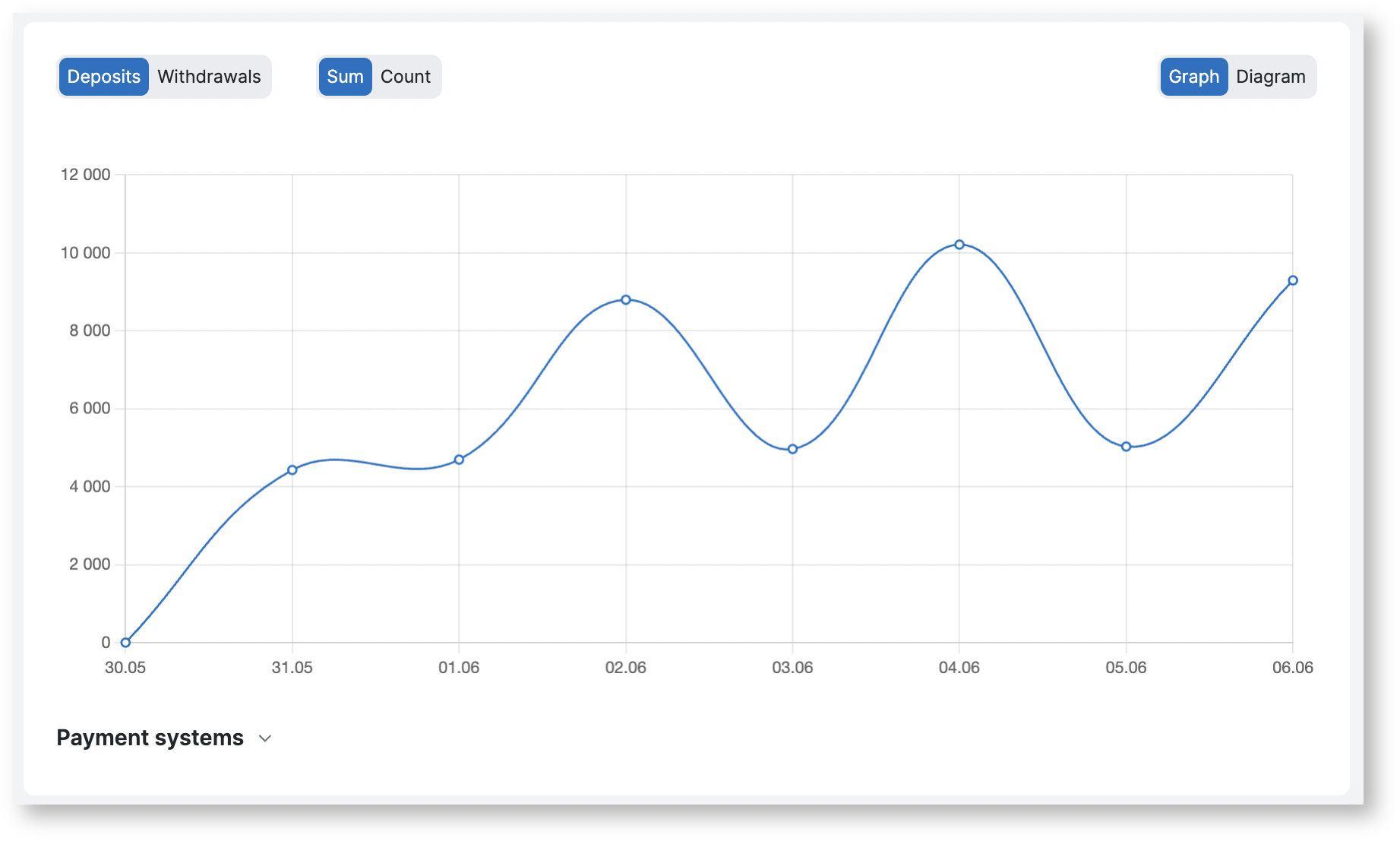 Вы можете сформировать график транзакций/выводов за определенный период, отобразить данные на графике в определенной валюте.