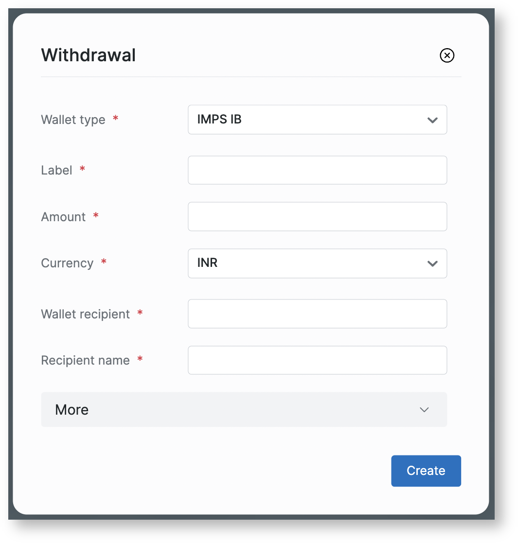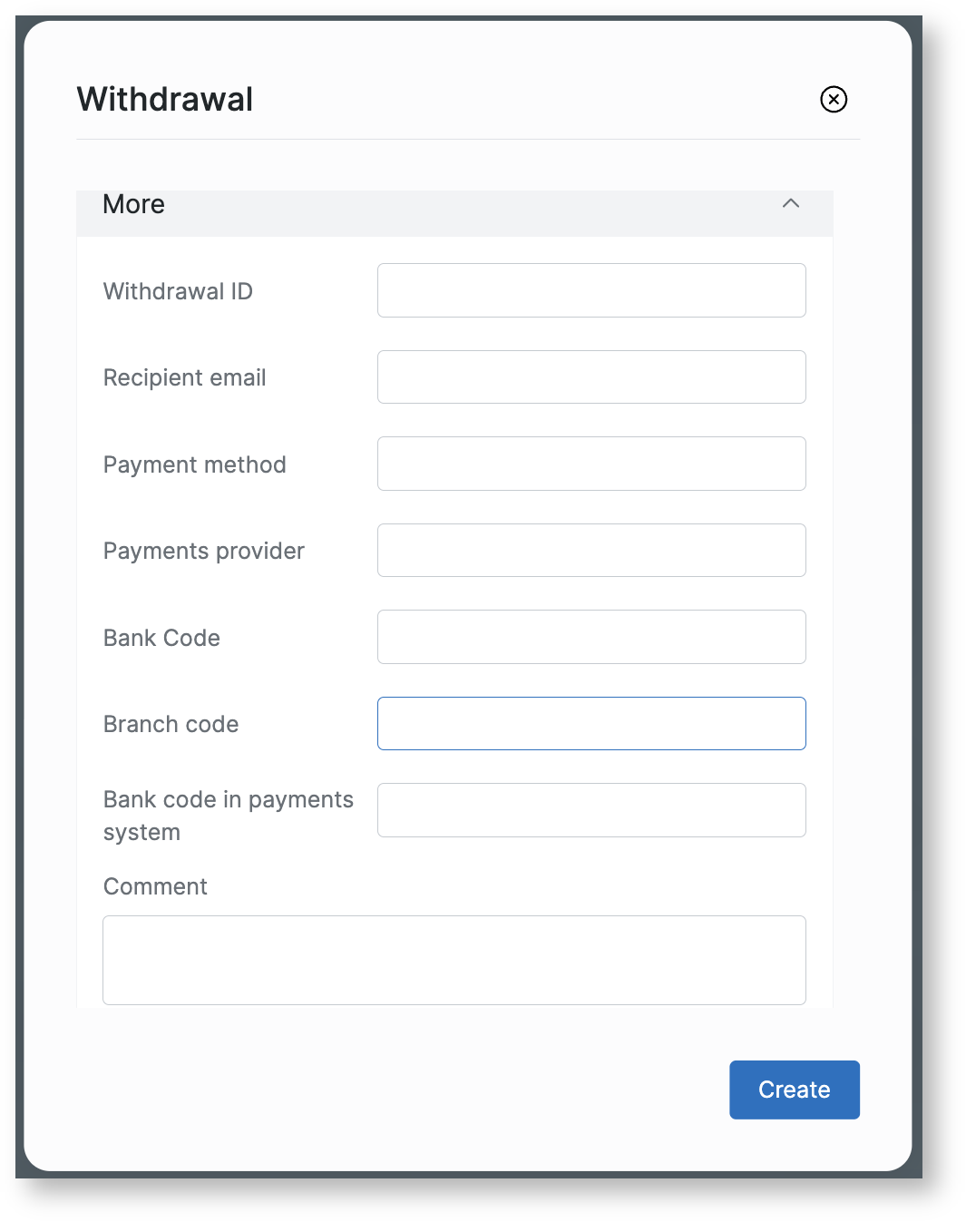 Для создания заявки на вывод, необходимо перейти на страницу Выводы (Оплаты → Выводы) и выполнить следующие шаги: