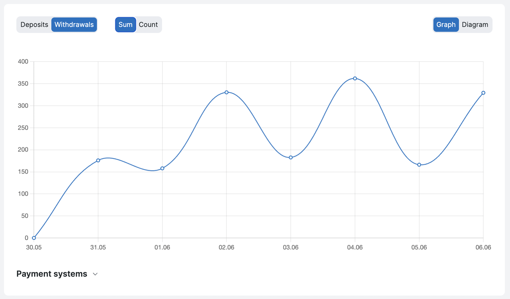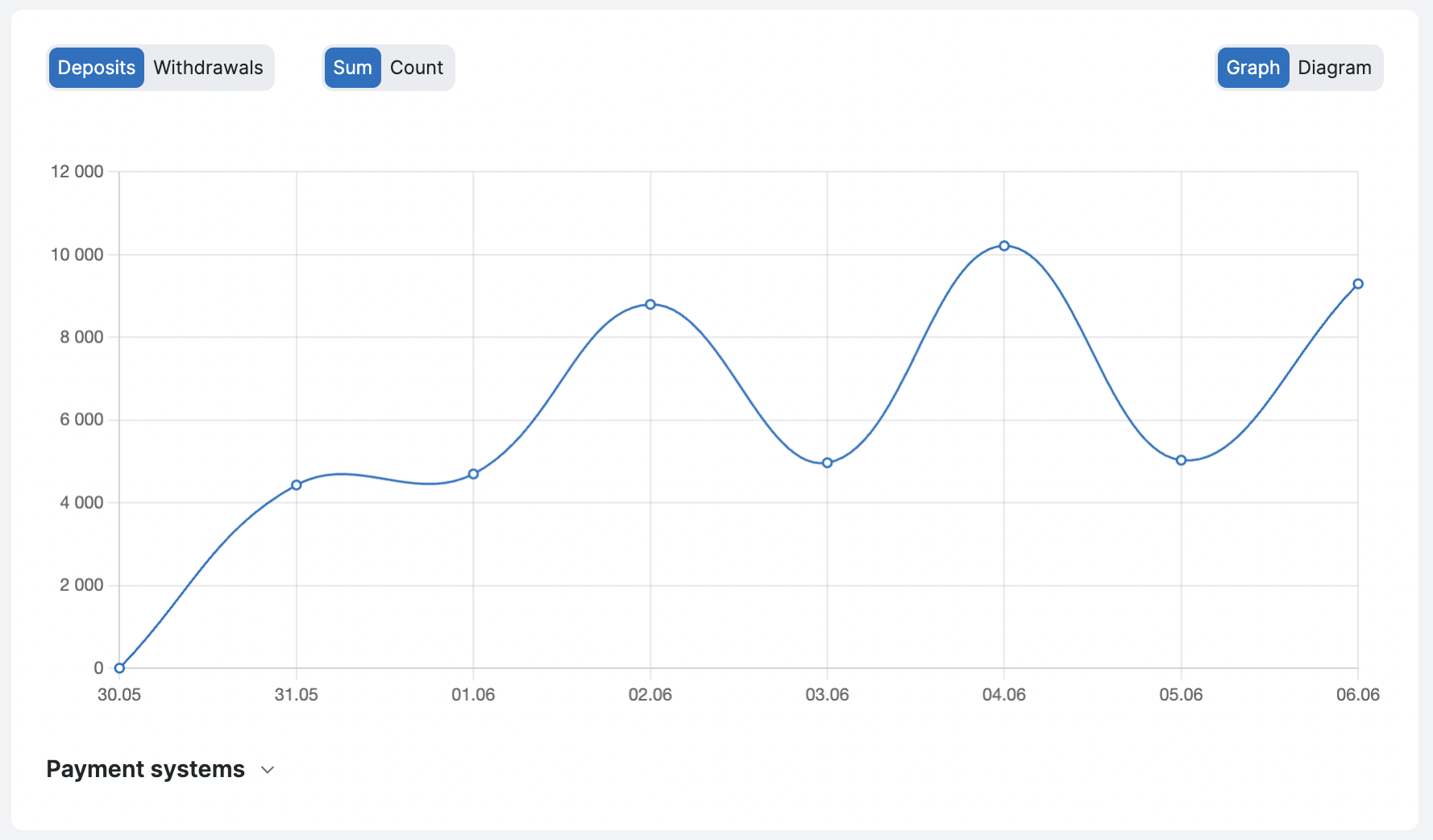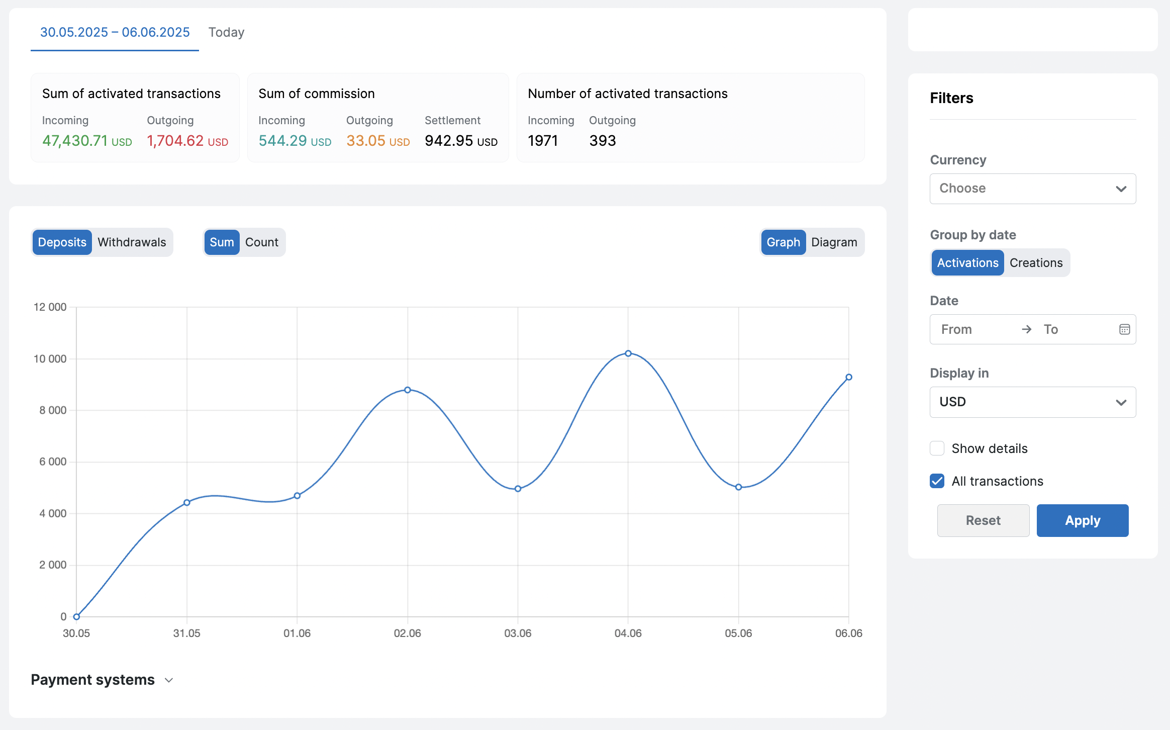 Вы можете сформировать график транзакций/выводов за определенный период, отобразить данные на графике в определенной валюте.
