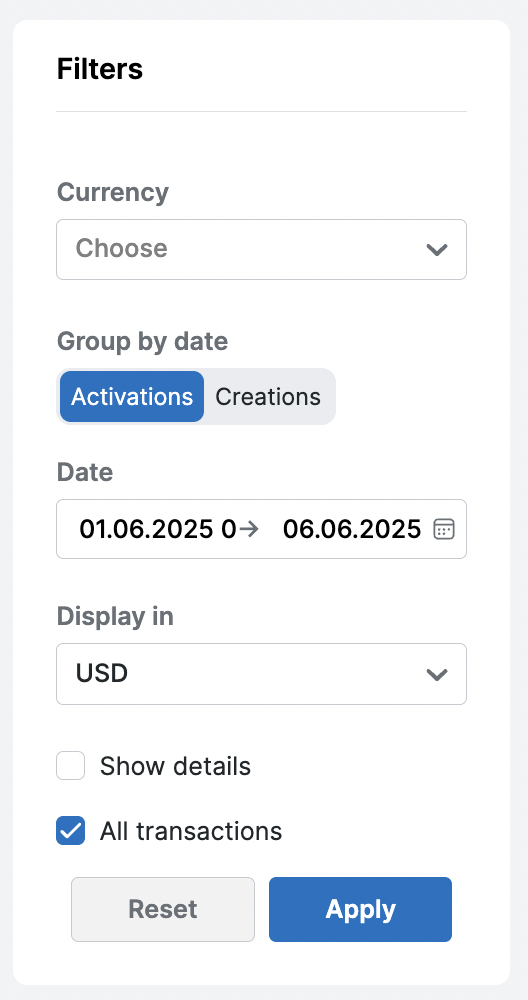 Включение фильтра "детализация" позволяет смотреть сумму (или количество) транзакций в валюте прихода.