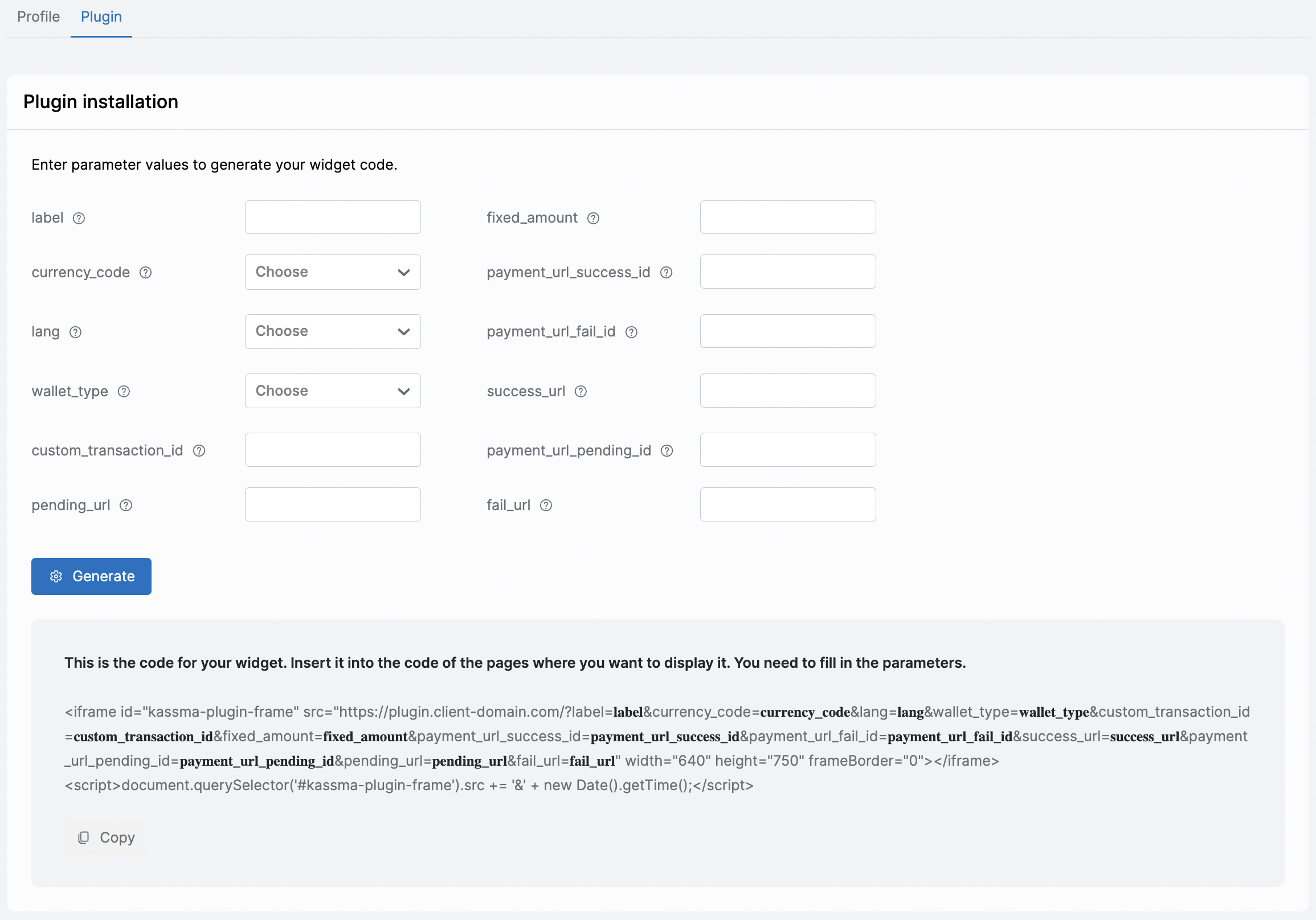Данный блок содержит тело плагина, интегрируемого на сайт Клиента, и описание вводимых параметров.