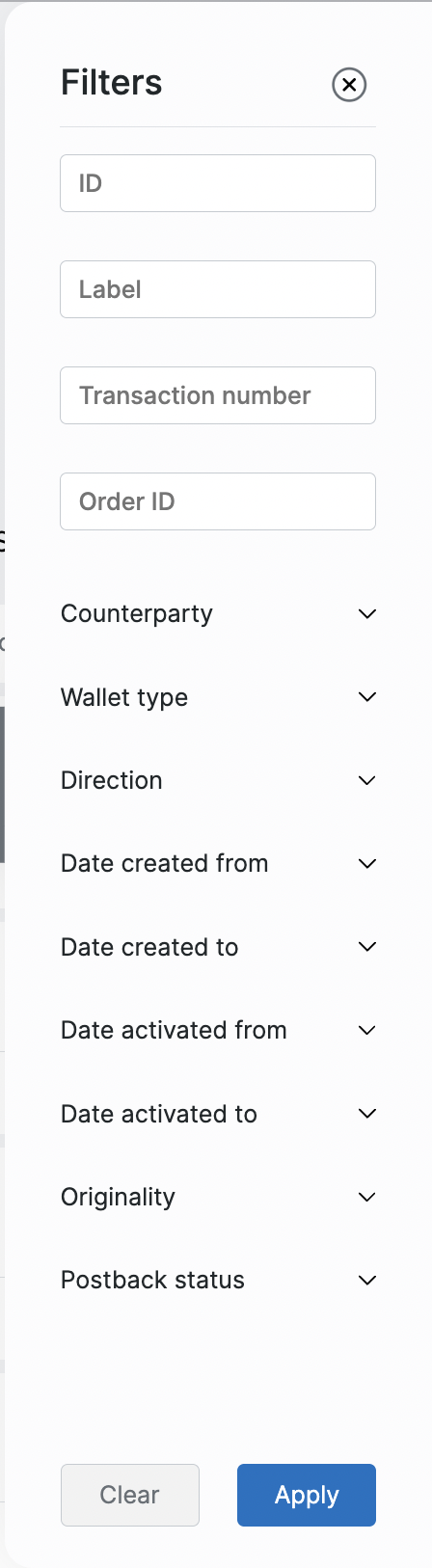 Фильтры страницы "Транзакции"