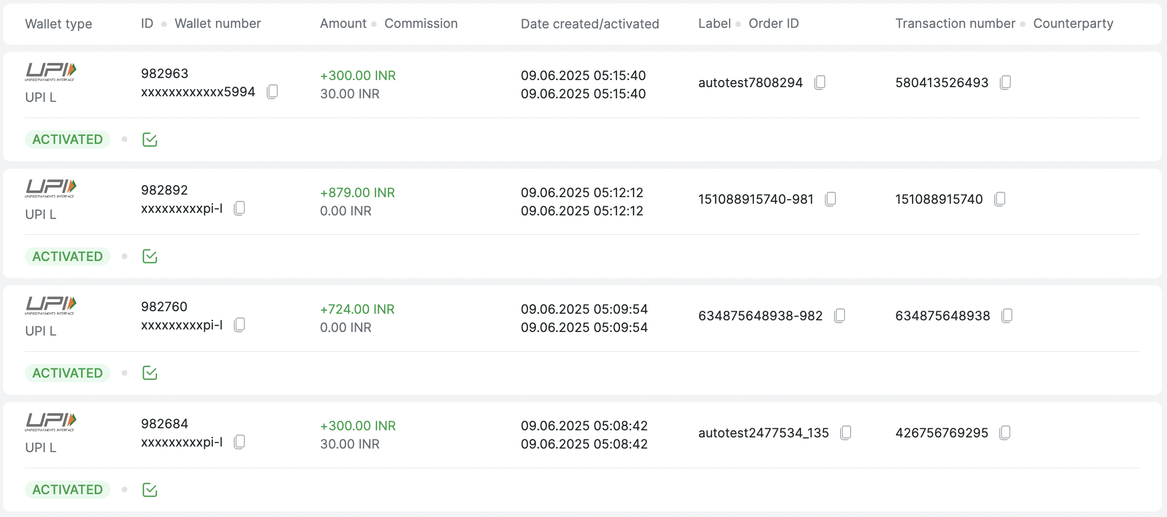 Дата создания/активацииОтображает дату создания и дату активации транзакции