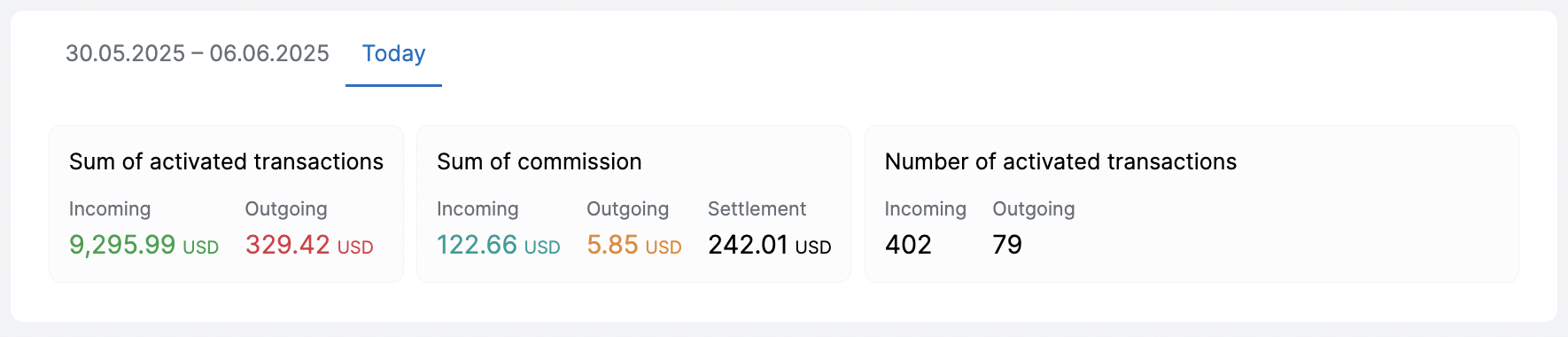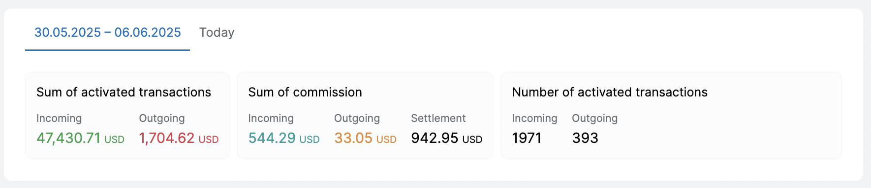 Статистическая информация о сумме активированных транзакций, количеству активированных транзакций за указанный выше период и аналогичная информация за текущий день.