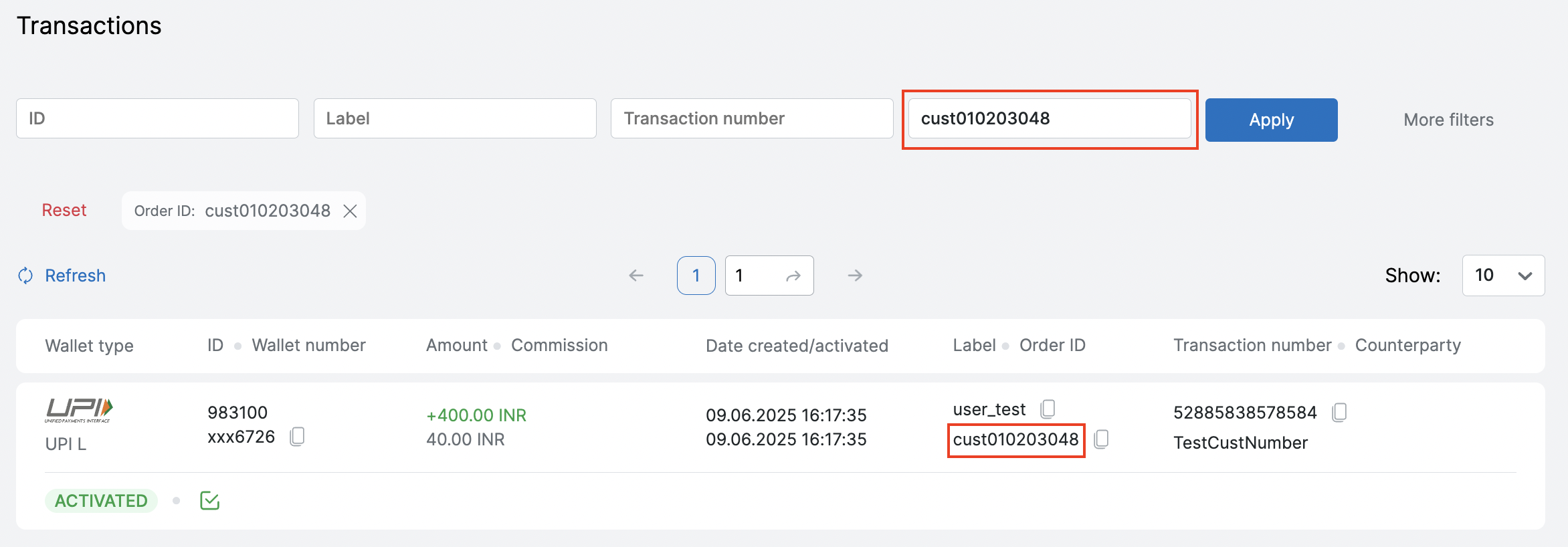 • фильтрация по дате активации транзакции;