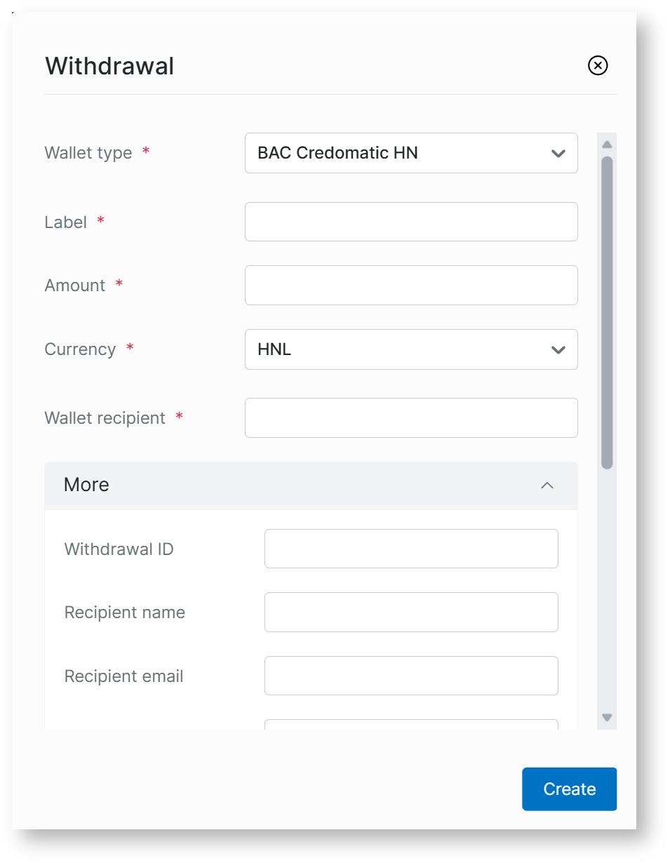 Required fields for BAC Credomatic HN withdrawal: