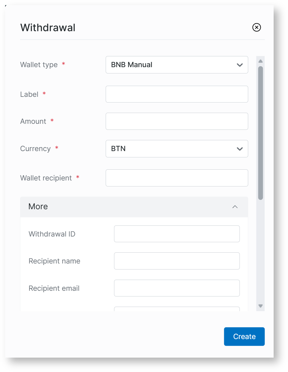 Required fields for BNB Manual withdrawal: