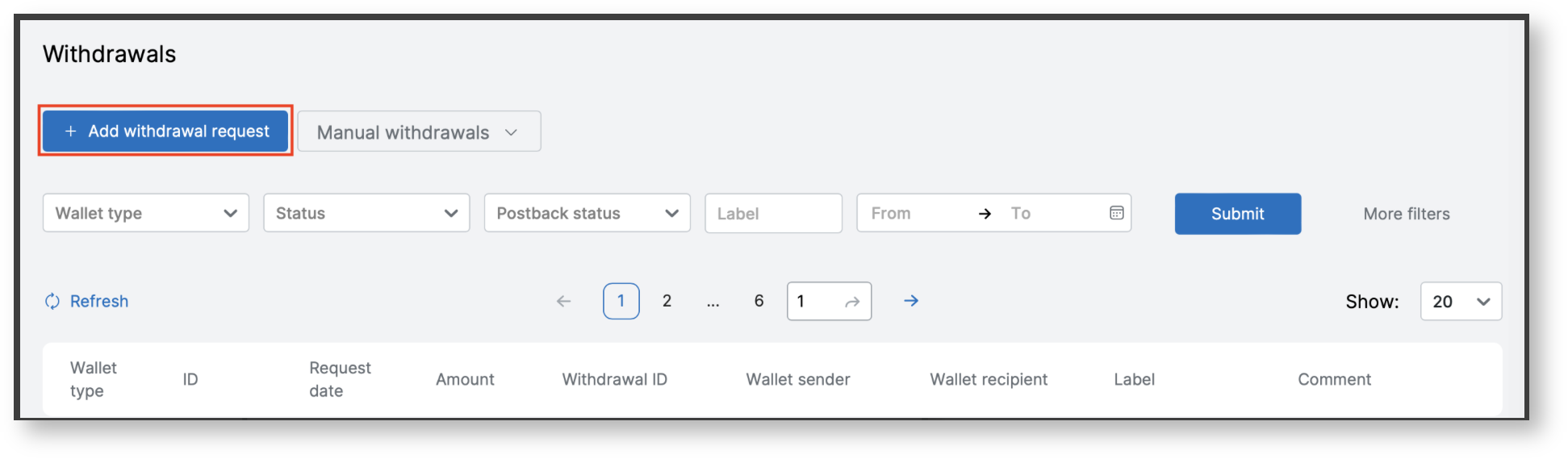 To create a withdrawal request, you need to go to the Withdrawals page Payments  → Withdrawals and perform the following steps