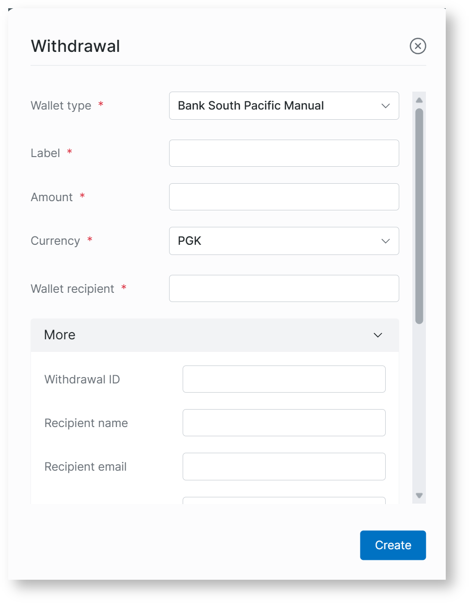 Required fields for Bank South Pacific Manual withdrawal: