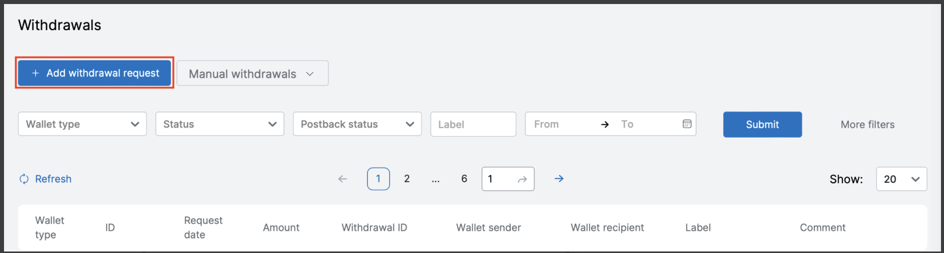 To create a withdrawal request, you need to go to the Withdrawals page Payments  → Withdrawals and perform the following steps
