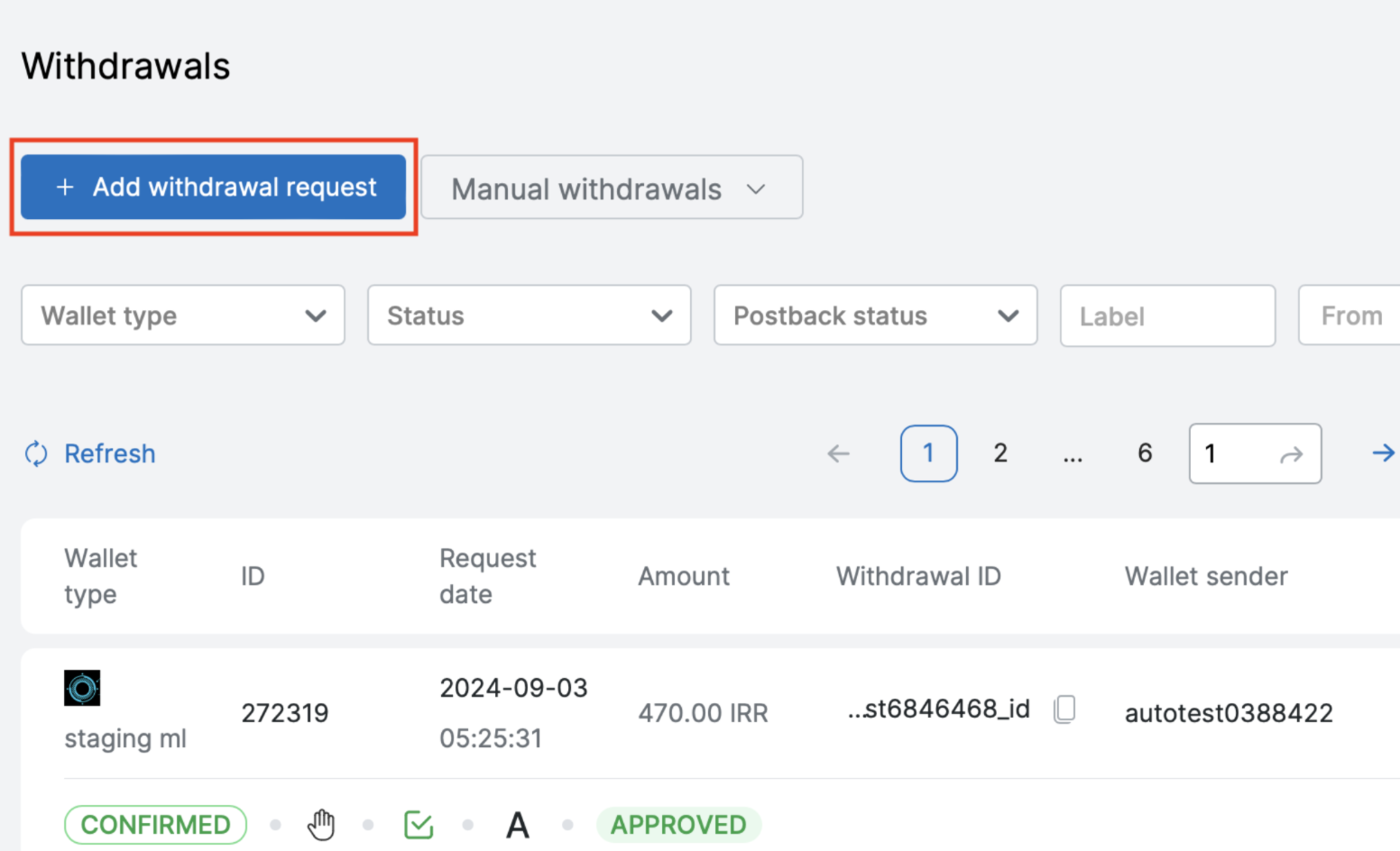 To create a withdrawal request, you need to go to the Withdrawals page Payments → Withdrawals and perform the following steps