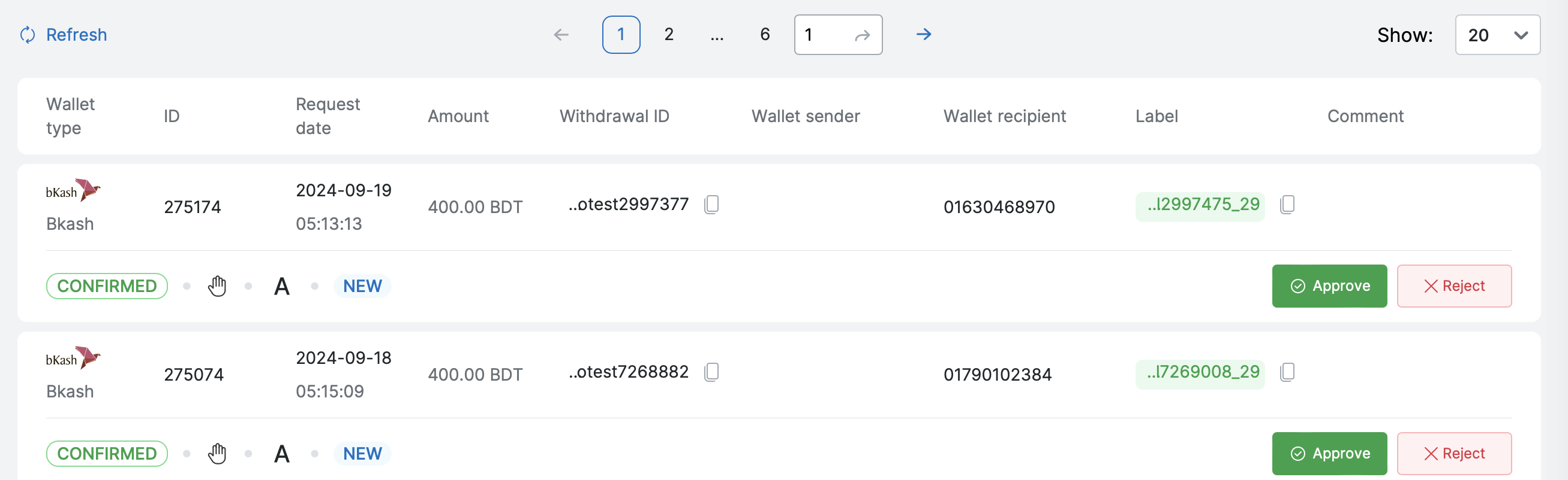 5 | REJECTED | Status for withdrawal when the withdrawal request was rejected. |