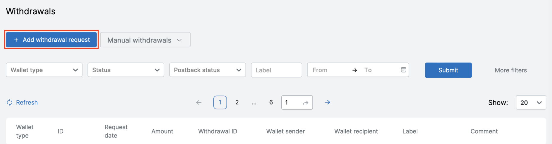 1. Нажмите на кнопку "Добавить заявку на вывод".