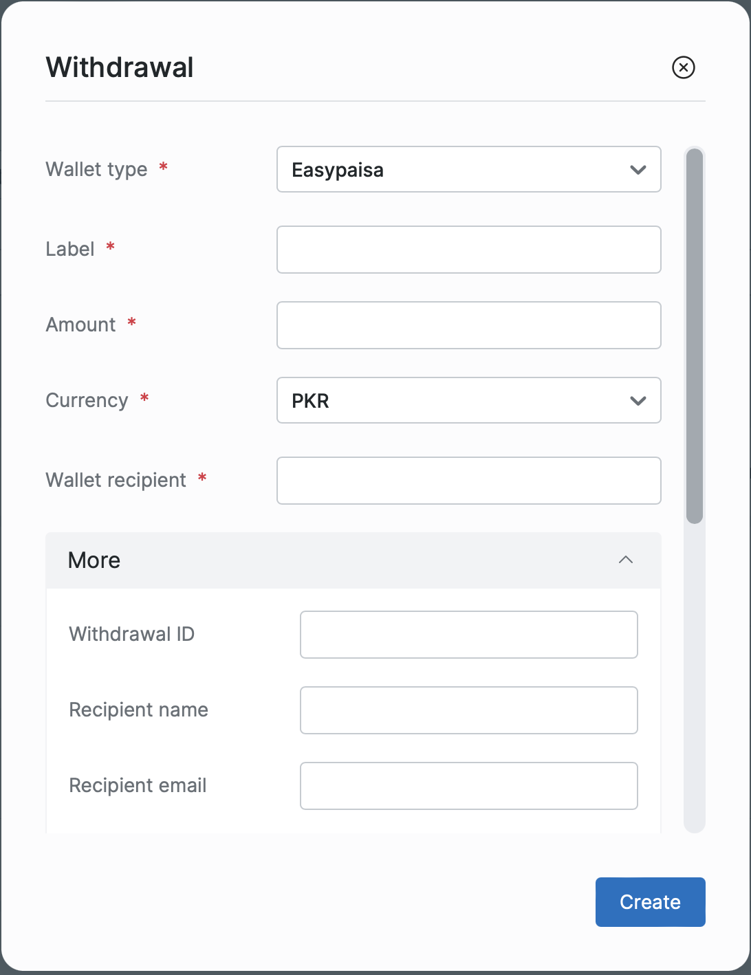 Required fields for EasyPaisa withdrawal: